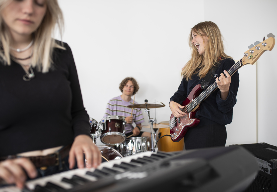 Efterskolens musiklokale er placeret på første sal i hallen med skøn udsigt over markerne. Musiklokalet rummer alt, hvad man har brug for til at spille sammen i et band.
